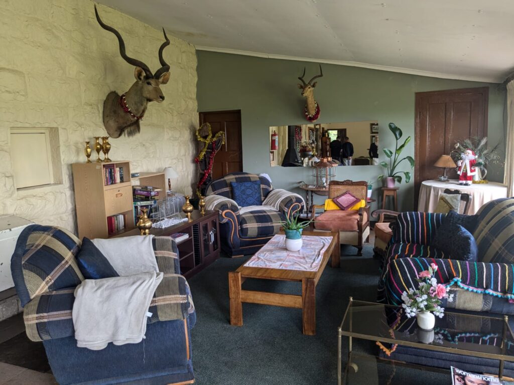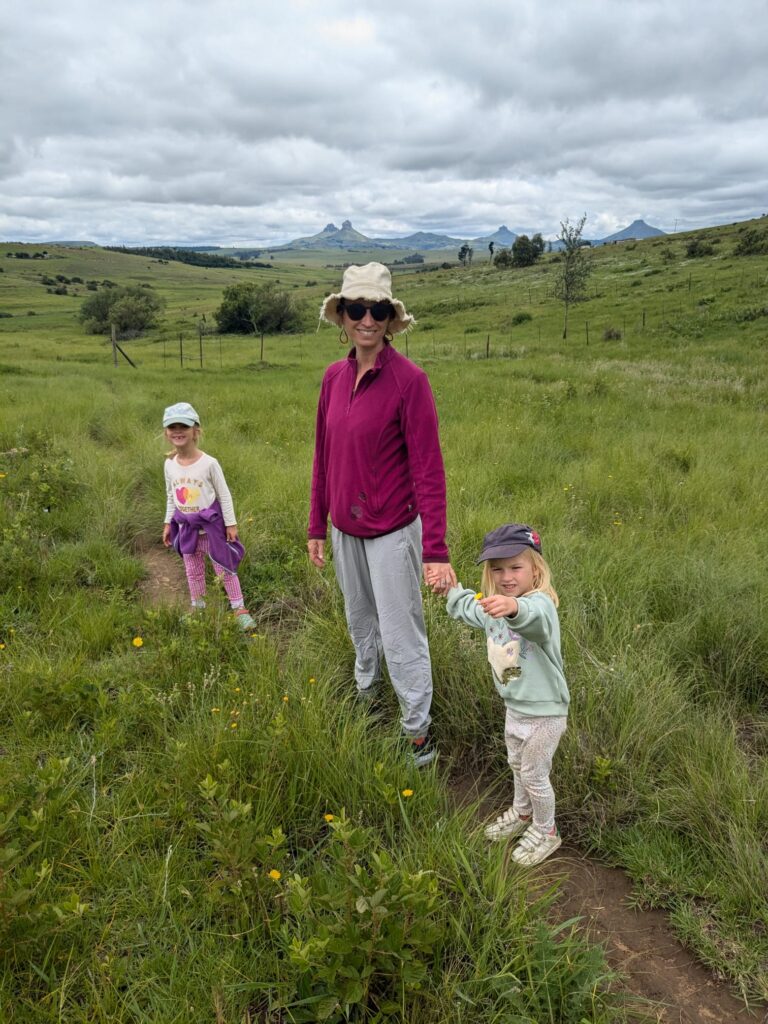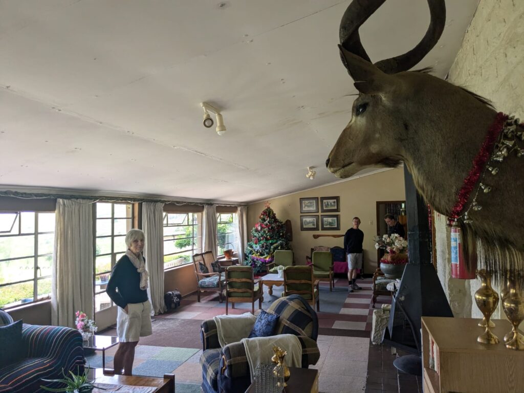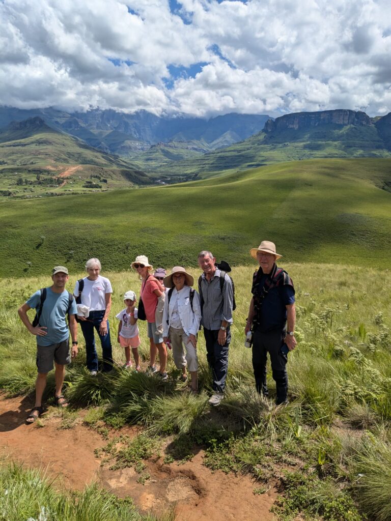 Magnifique région verdoyante, avec des sommets de montagnes aux formes étonnantes. On arrive au bout du monde par une longue piste caillouteuse, puis une barrière. C’est bien là que nous restons trois nuits : Oban farm à Van Reenen (altitude 1700 m), des prairies à perte de vue avec des vaches, quelque chevaux. La chambre d’hôte est rustique, déco anglo-kitch un peu surannée, amplifiée par les décos de noël un peu partout. Mais on s’y sent « à la maison » : plusieurs salons avec fauteuils, canapés profonds, moquettes, bibliothèques, têtes d’animaux empaillés au mur, tableaux, moultes bibelots et, grand confort, un poêle à bois, très apprécié le premier soir. Nous sommes quasiment seuls donc nous squattons le salon. Les filles ont adopté la « salle de jeux » proche de la salle à manger, un vrai bonheur pour le repos des parents et grands parents. Nous avons quand même quitté ce havre de paix pour nous rendre à une heure et demie de là, dans le Royal Natal National Park : un cadre spectaculaire avec l’Amphithéâtre, cirque rocheux, des falaises hautes de 1000 m, dominés par le Mont aux Sources (3282 m).