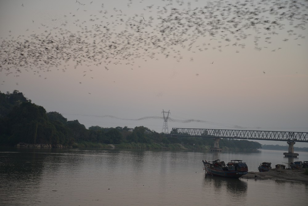 Nous sympathisons avec deux couples, un belge, un palois avec lesquels nous prévoyons deux jours de visites, le premier en tour organisé classique (mais climatisé!). On nous promène de pagodes en grottes, on agrémente le tout de superbes paysages, de promenade en bateau et on termine à la nuit par la sortie des chauve-souris… 400 000 qui quittent la grotte en l’espace de 15 minutes. Impressionnant !