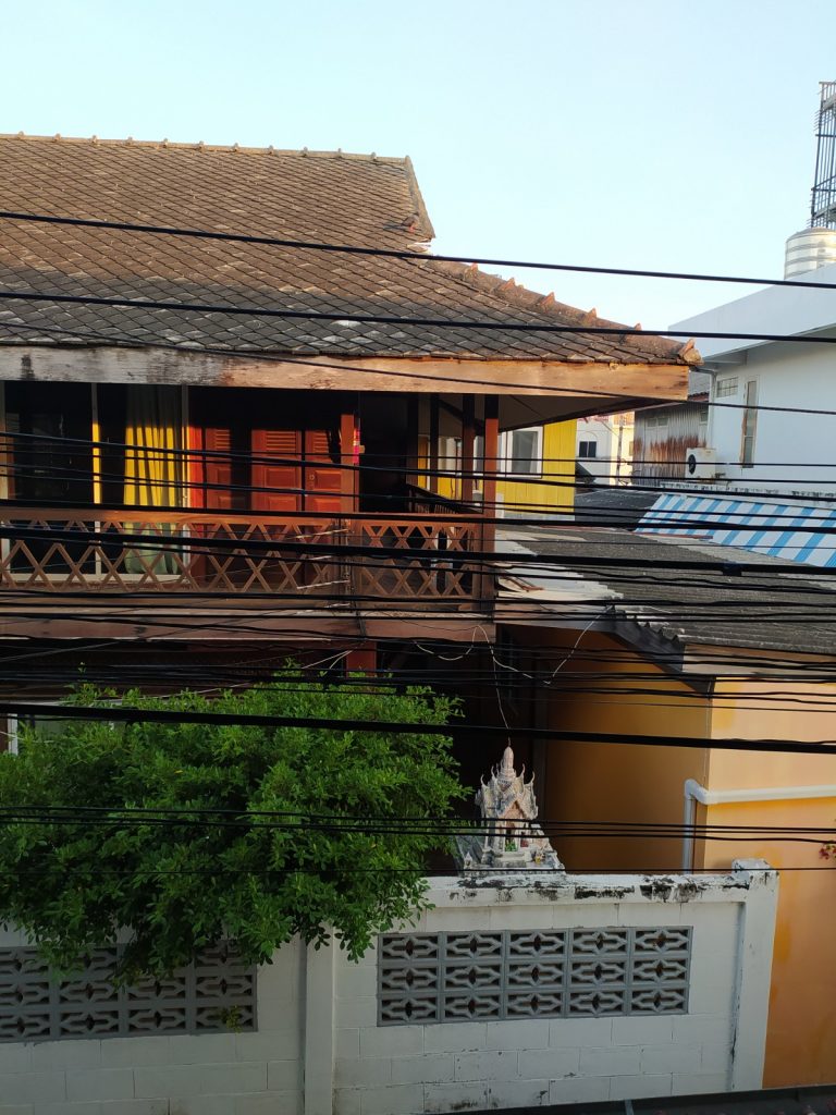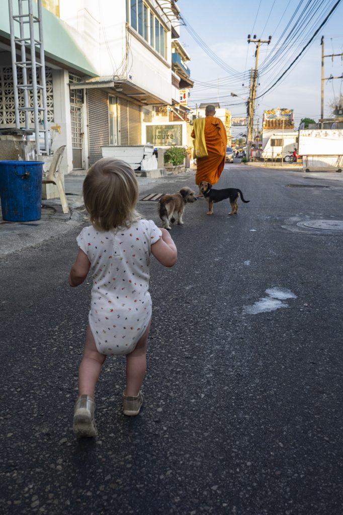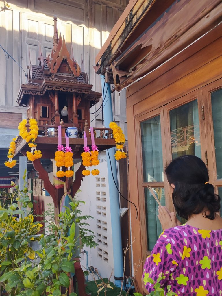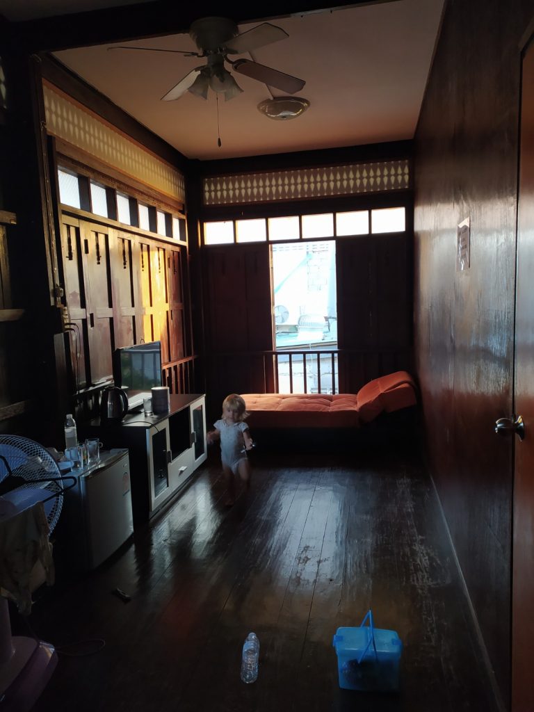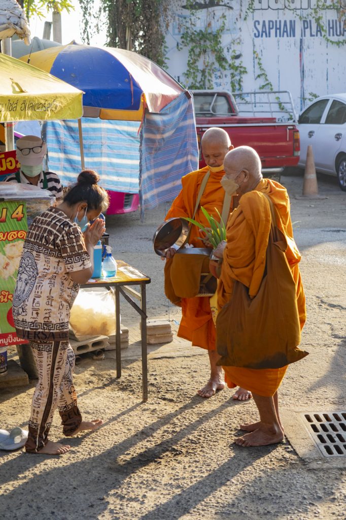 Hua Hin : Notre hôtel, Mandarin, est typique de la rue Naresdamri, quartier ancien de Hua Hin, avec ses maison en bois avec terrasses, les restaurants avec ponton au dessus de la mer. Il est composé d’un ensemble de maisons traditionnelles en bois, nous y occupons un étage avec deux chambres, un espace à vivre. Ouvertures sans vitres et, heureusement pour nous, climatisation et ventilateurs. Petite piscine en prime. Comme Thalie se réveille tôt (6h30, 7 h), on sort immédiatement afin de permettre à sa sœur de dormir. Ca nous permet d’avoir une belle lumière et de profiter de l’éveil de la ville. Les restaurants et boutiques sont encore fermés, les moines collectent des dons, les particuliers déposent des offrandes dans les maisons des esprits, les petits marchands proposent des brochettes, sur la jetée, les pêcheurs lancent leurs filets, les bateaux de pêches sont déjà rentrés. De nombreux restaurants et autres boutiques n’ont pas rouvert après le covid, et il est difficile de trouver un endroit où prendre le petit déjeuner. On finit par acheter pain, beurre et yaourts dans un 7/11.