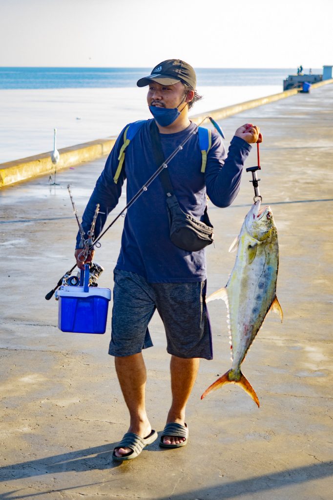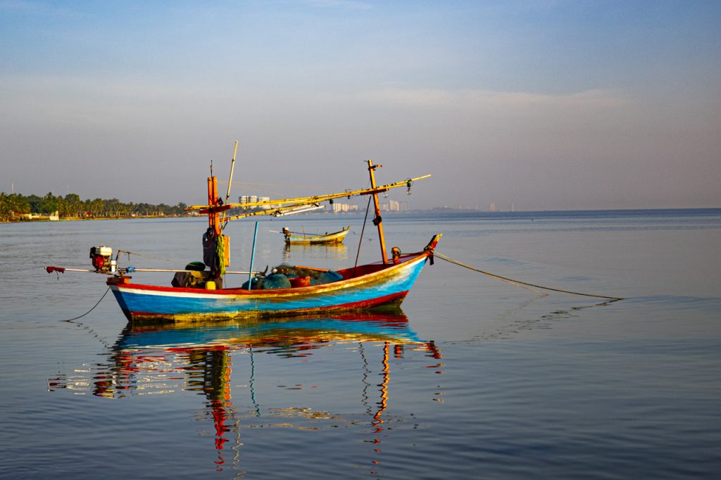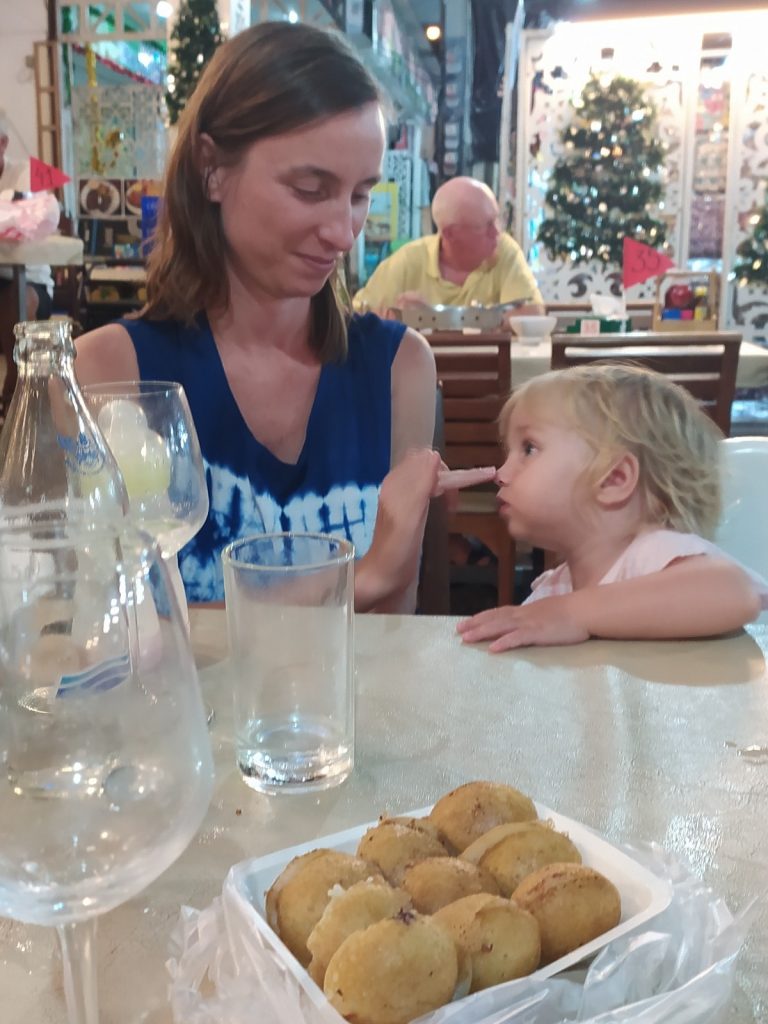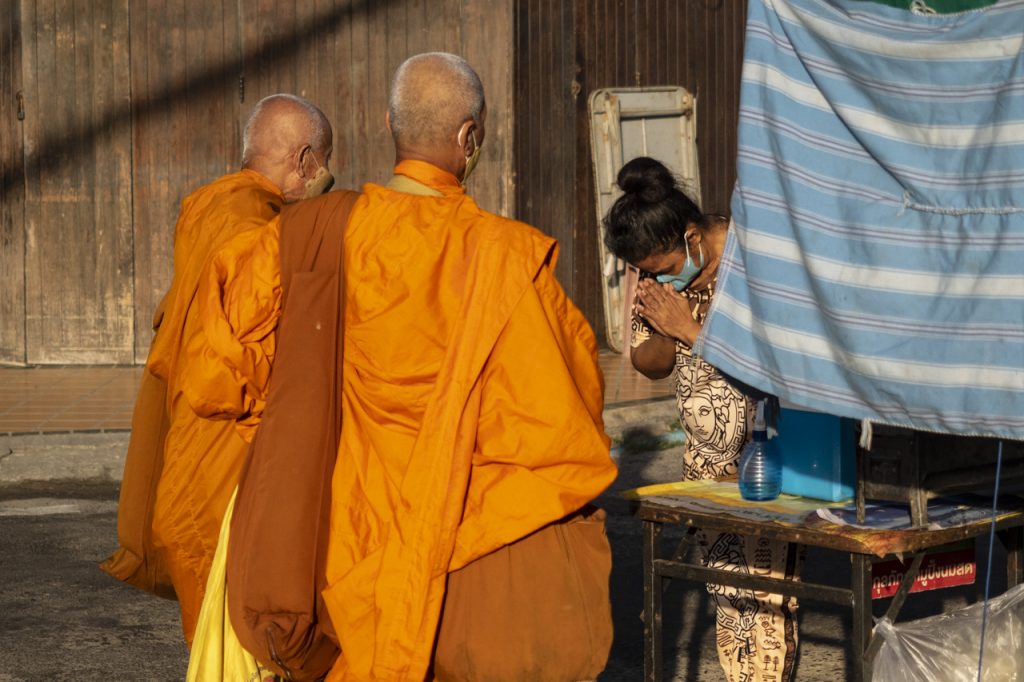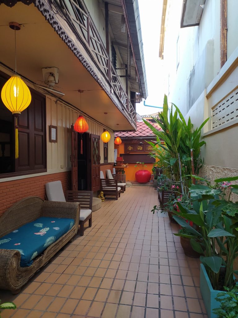 Hua Hin : Notre hôtel, Mandarin, est typique de la rue Naresdamri, quartier ancien de Hua Hin, avec ses maison en bois avec terrasses, les restaurants avec ponton au dessus de la mer. Il est composé d’un ensemble de maisons traditionnelles en bois, nous y occupons un étage avec deux chambres, un espace à vivre. Ouvertures sans vitres et, heureusement pour nous, climatisation et ventilateurs. Petite piscine en prime. Comme Thalie se réveille tôt (6h30, 7 h), on sort immédiatement afin de permettre à sa sœur de dormir. Ca nous permet d’avoir une belle lumière et de profiter de l’éveil de la ville. Les restaurants et boutiques sont encore fermés, les moines collectent des dons, les particuliers déposent des offrandes dans les maisons des esprits, les petits marchands proposent des brochettes, sur la jetée, les pêcheurs lancent leurs filets, les bateaux de pêches sont déjà rentrés. De nombreux restaurants et autres boutiques n’ont pas rouvert après le covid, et il est difficile de trouver un endroit où prendre le petit déjeuner. On finit par acheter pain, beurre et yaourts dans un 7/11.