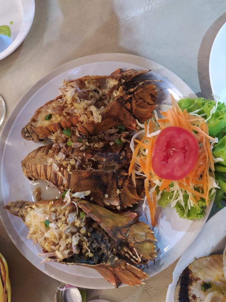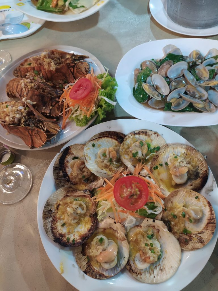 Soirée marché de nuit, avec pléthore de stands avec toutes sortes de nourritures appétissantes, boutiques de vêtements, objets en plastique, artisanat… Nous nous posons dans un restaurant avec barbecue dans la rue : coques au basilic qui nous rappellent celles de Dawan, rock lobster (en français langouste mais elles n’ont pas la même forme que les langoustes habituelles, plus aplaties et trapues), calamar grillé et en dessert, ces délicieux petits gateaux au lait de coco (khanom Krock) cuits dans de grandes poêles à alvéoles ?