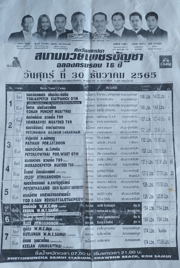 Autre activité sympathique, nous nous sommes vus offrir par les jeunes une soirée match de boxe thaïe. Des voitures passant dans la rue à longueur de journée annoncent à grand renfort de musique tonitruante les matchs prévus, donc on est bien informé !
