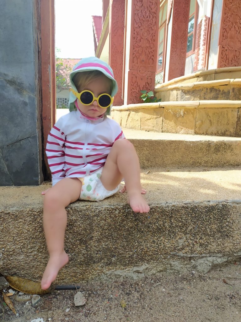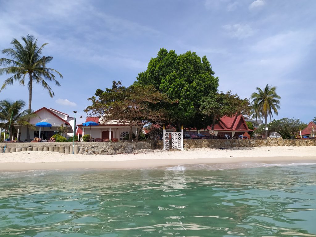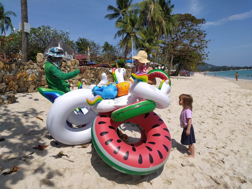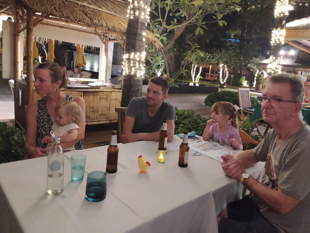 Pour casser un peu le train train, nous passons une journée avec des amis du Congo de Mélina et Adrien à la plage de Choengmon au « Lost Beach Bar » qui semble au milieu de nulle part, un bar qui nous fait revenir trente ans en arrière, tout en bois, bambous, musique reggae. La crique serait charmante si les laisses de mer (naturelles mais aussi malheureusement beaucoup de plastique ) ne s’y rassemblaient pas. Déjeuner pieds dans le sable, charmante île privée en face quasiment reliée à notre plage par une bande de sable blanc. Ça ne vaut pas notre plage de Chaweng.