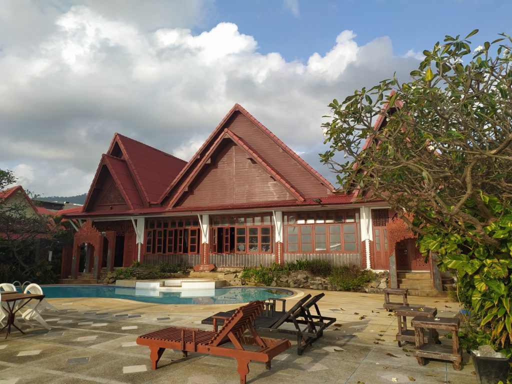 Koh Samui, pour nous, c’est l’île avec un grand Î, pratiquement la première où nous avons séjourné pour des vacances lors de notre vie thaïlandaise. C’était le bungalow en bois à 150 B (37,5 F / 5 €) en bord de plage avec une famille qui gérait tout. Puis les bungalows sont devenus plus solides, une piscine a été ajoutée, le standing est monté encore… Aujourd’hui, sur la même plage (Chaweng) c’est une succession de complexes souvent bruyants, fortement illuminés le soir. Tous les niveaux de confort cohabitent, de l’hôtel de luxe à l’ensemble construit de bric et de broc avec, après le passage covid, des espaces maintenant à l’abandon. Notre hôtel lui même semble se réveiller et lentement se remettre de sa longue fermeture. A priori, un peu partout, le manque de personnel est criant. Nombre de guest houses ne proposent plus de repas. Nos chambres, dans deux bungalows sont coquettes, grandes, vieillottes mais dans le style thaï. On aime bien. Le bungalows sont alignés le long d’une petite allée très arborée qui mène à la mer et à l’une des deux piscines près de laquelle nous installons nos quartiers chaque jour. Le bâtiment de l’accueil est kitchissime, celui du restaurant où sont servis les petits déjeuners mériterait, avec son mobilier un bon coup de karcher. On sent que le petit nombre de personnel a du mal a gérer l’entretien. Nos bungalows sont propres, la plage est superbe, peu fréquentée, la mer délicieuse, un peu agitée. Les journées passent entre la piscine, la plage le choix des restos et les massages pour les adeptes. La température est idéale, même si le vent est un peu trop présent. Nous n’avons pas vu encore la mer étale et transparente.